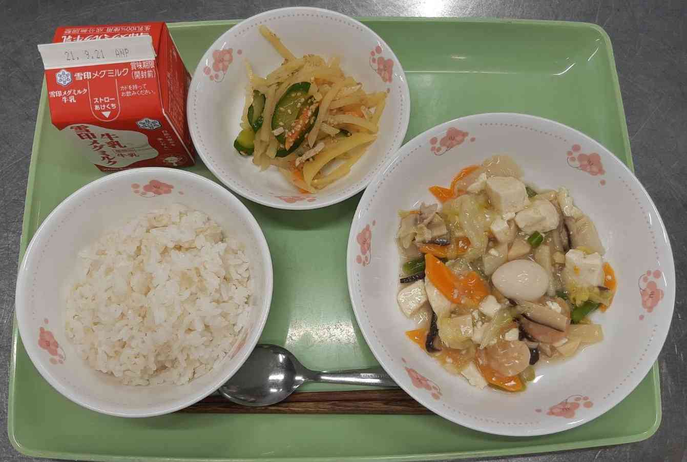 今日の献立は、「ごはん・豆腐とえびの中華炒め・千切りじゃがいものゆで野菜・牛乳」です。