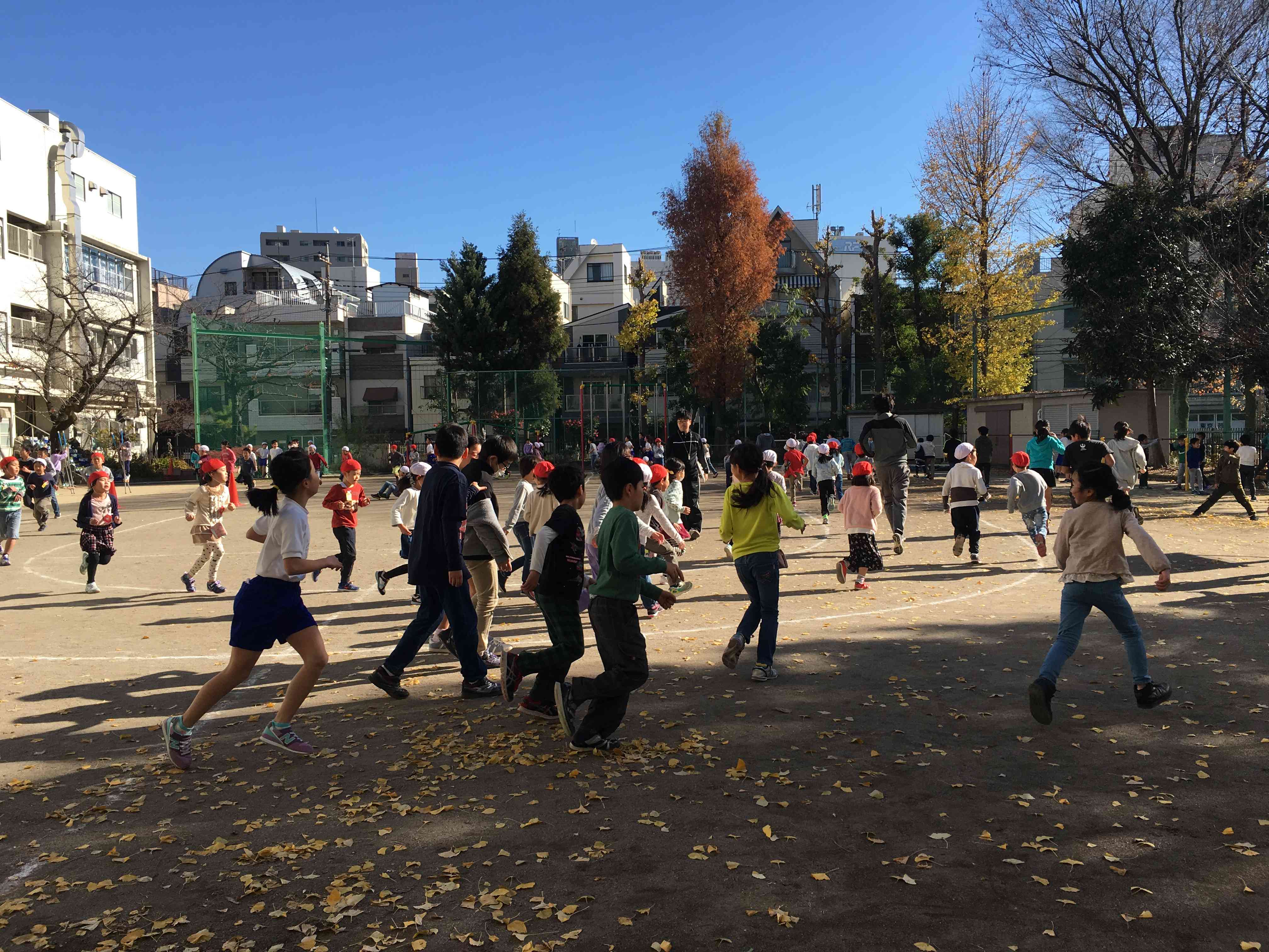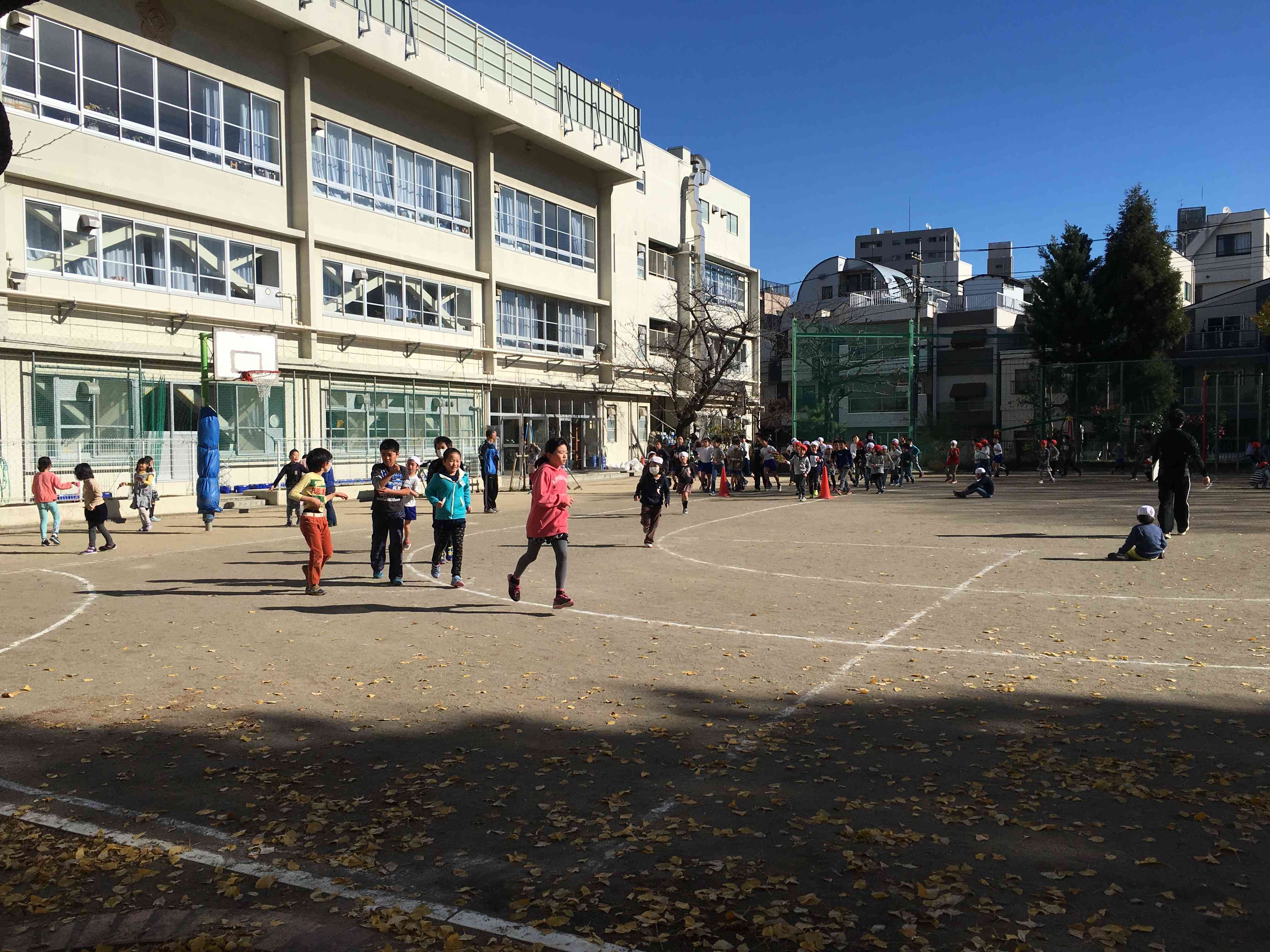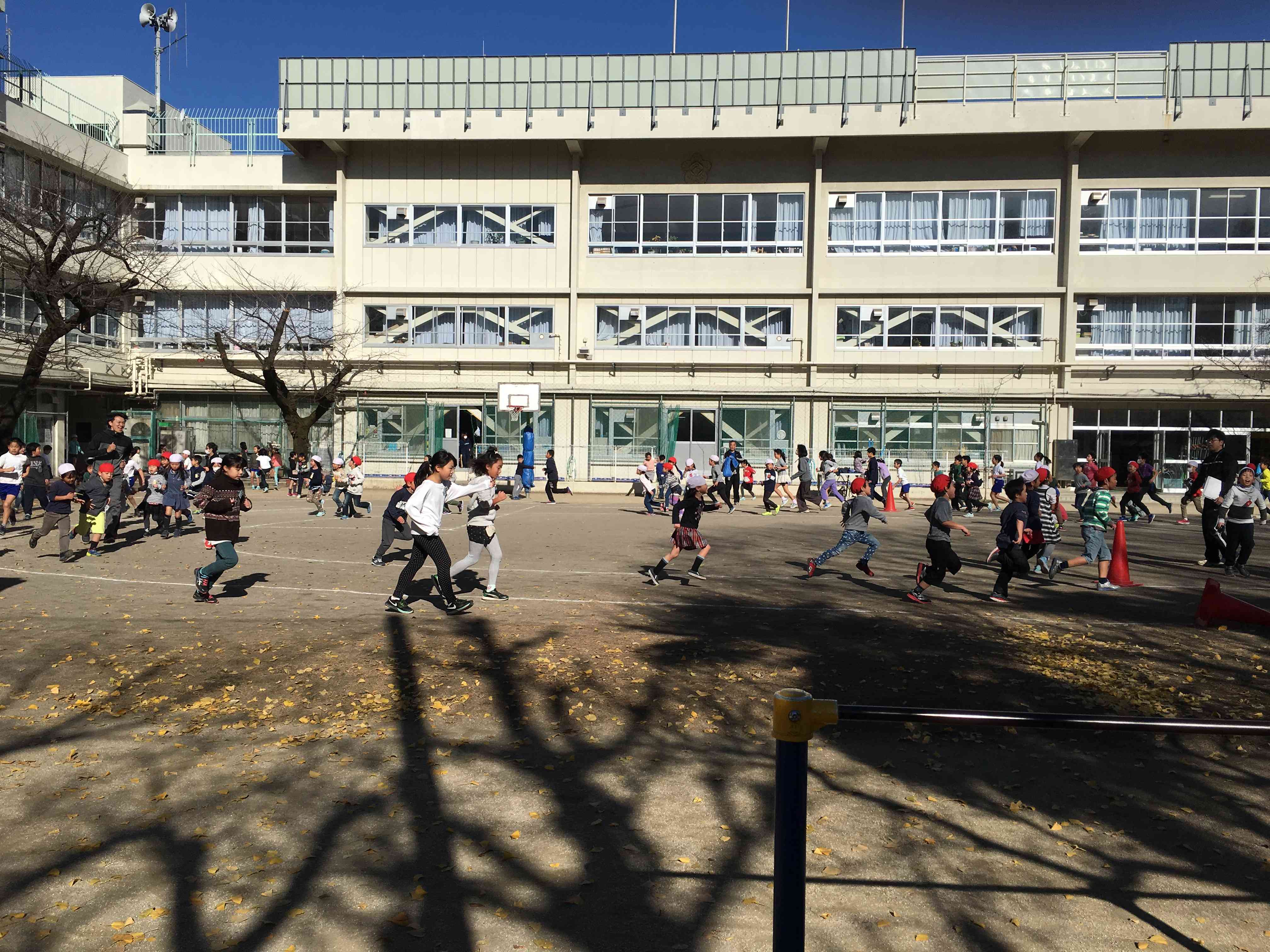 今日は天気はとても良いのですが、寒いです。 でも、子供達は元気に校庭を走っていますよ。 今日は1年生と4年生が走る日だったようです。