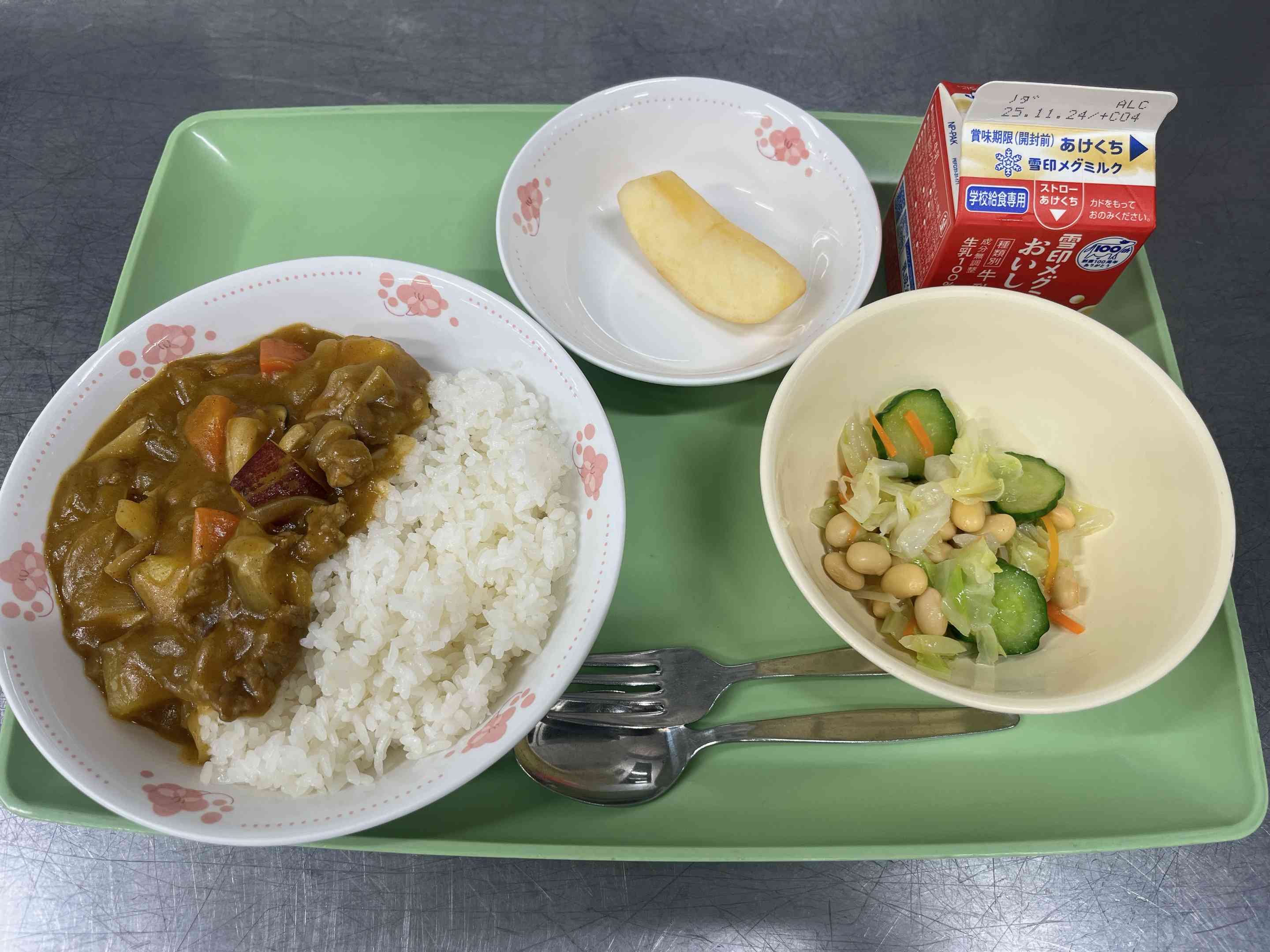 今日の献立は「秋野菜のカレーライス、大豆サラダ、りんご(ジョナゴールド)、牛乳」です。