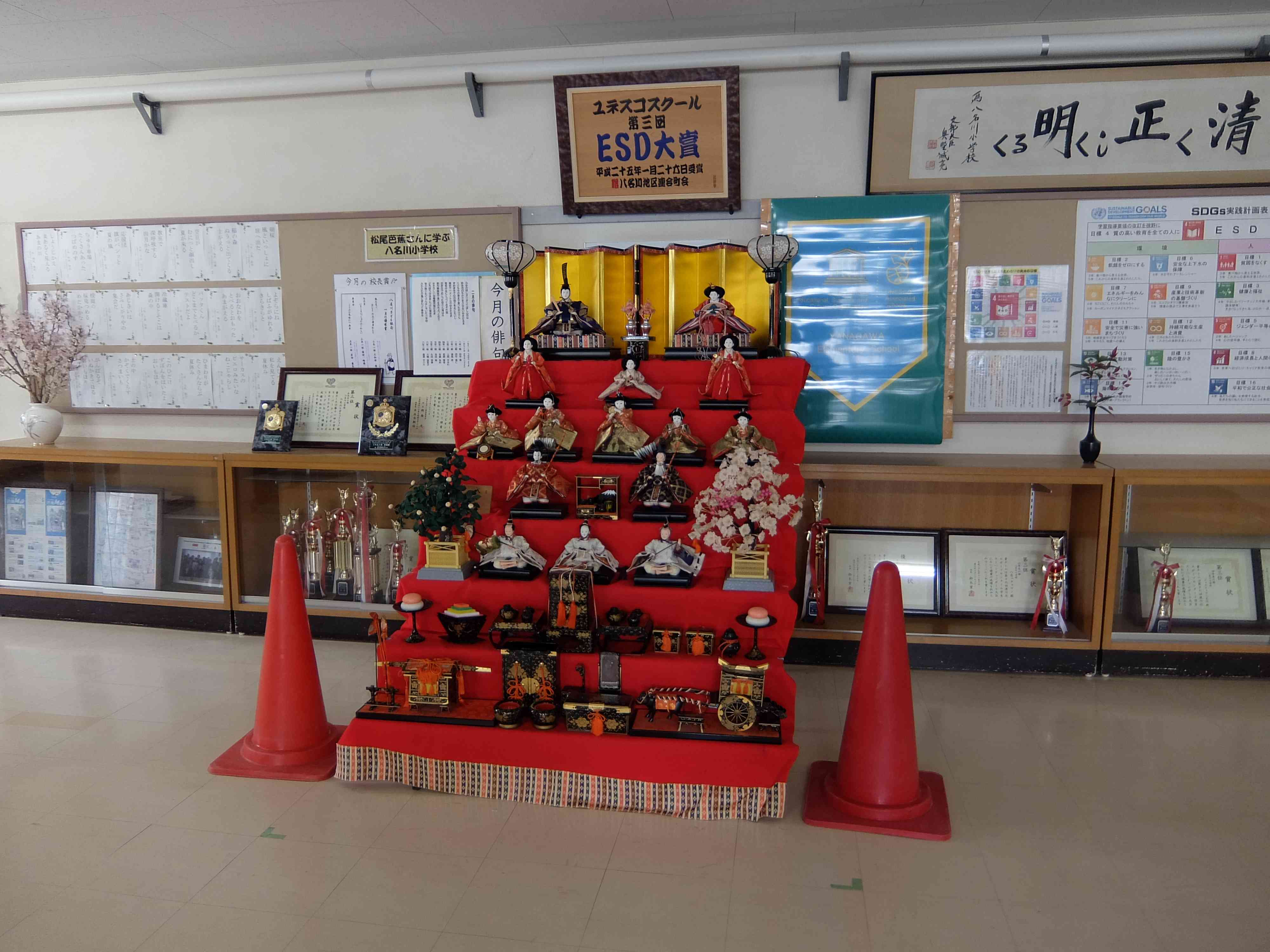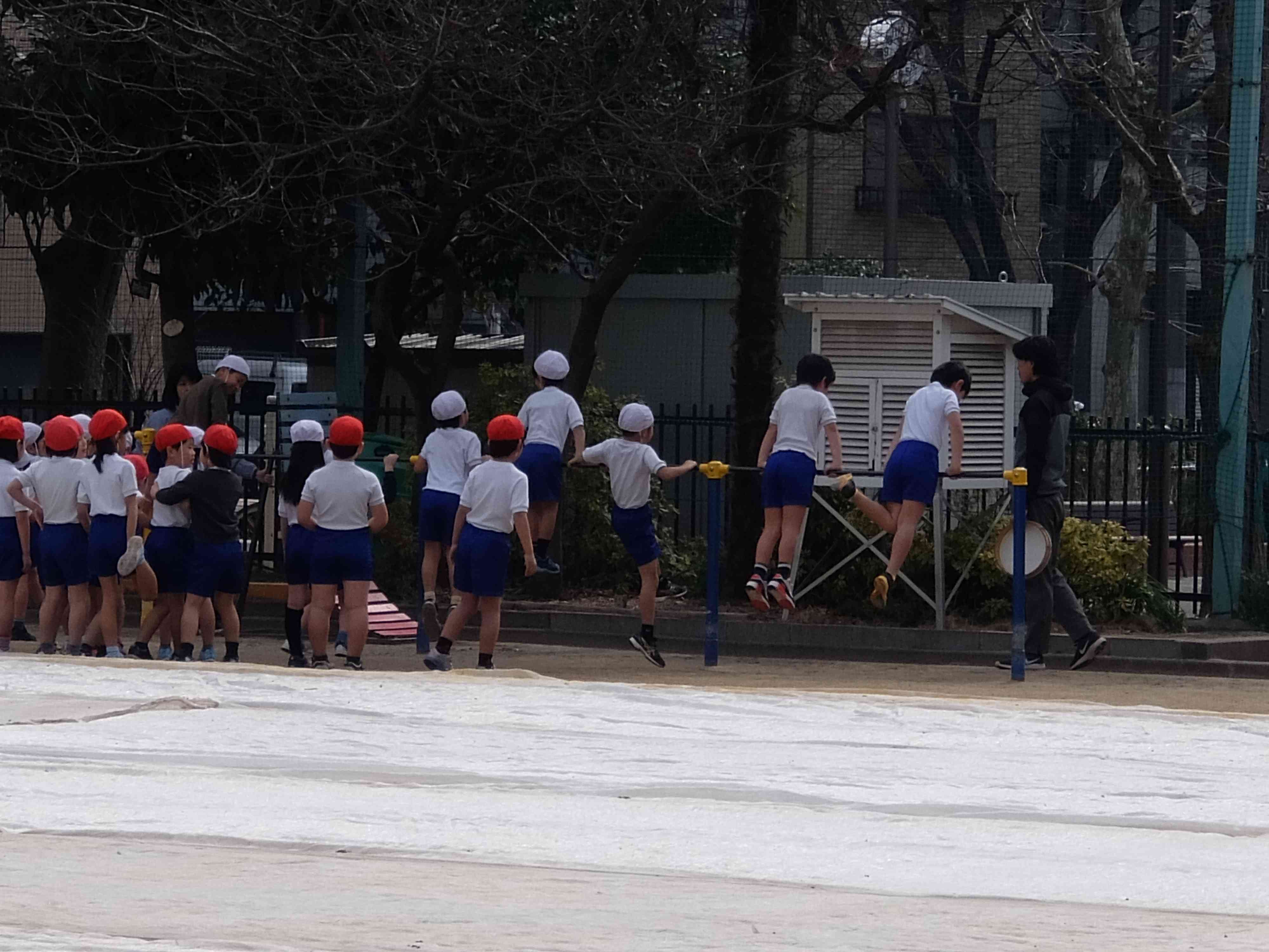 4時間目の様子を見に行ってきました。 1年生が校庭で体育の授業をしていました。 現在は芝生の養生中ということです。 念入りに準備運動をしてから、鉄棒へ。 鉄棒にぴょんと飛び乗り、しばらくそのまま我慢。 まえまわりの導入のような授業でした。 玄関には立派なおひなさまが飾られています。