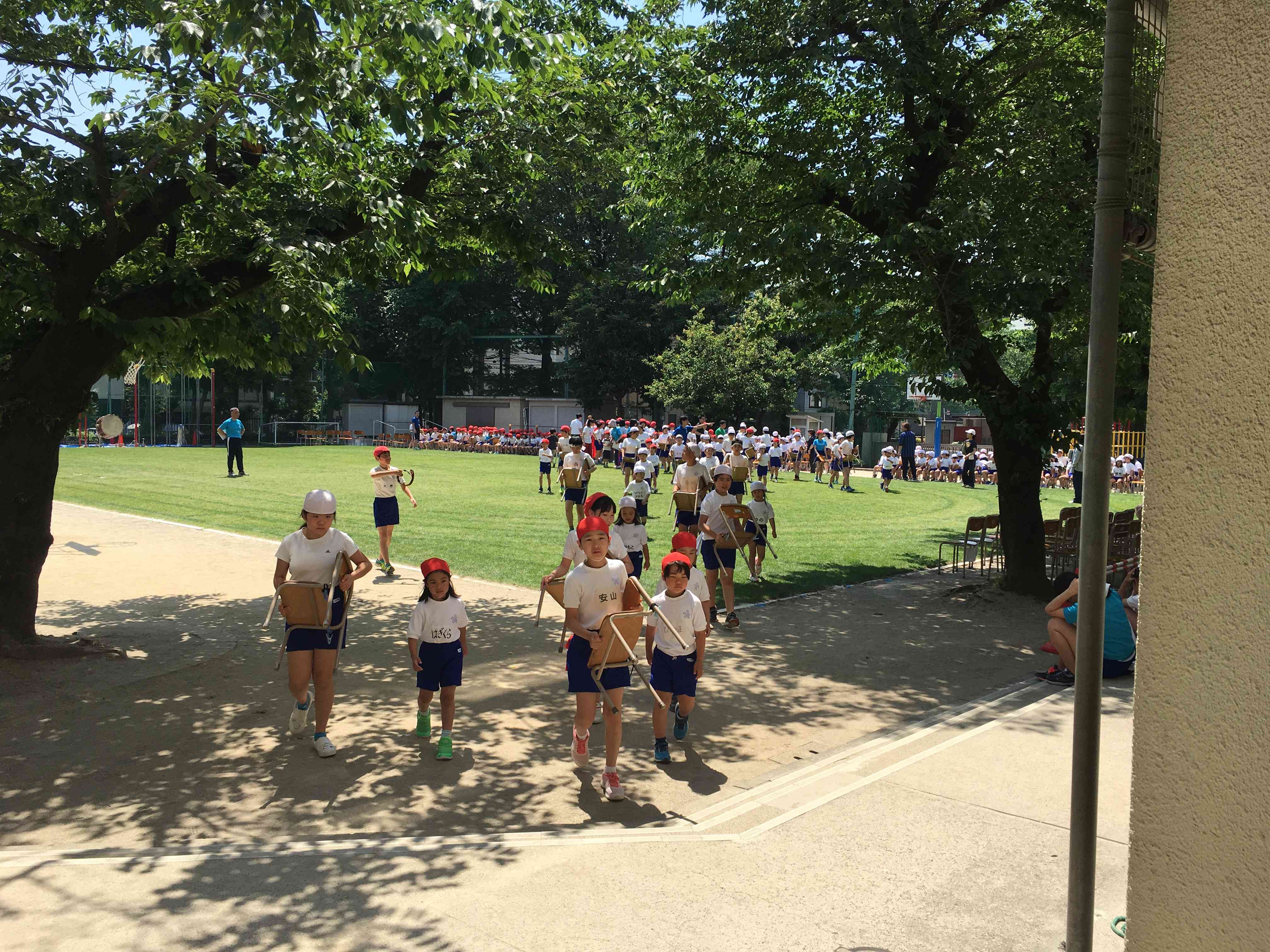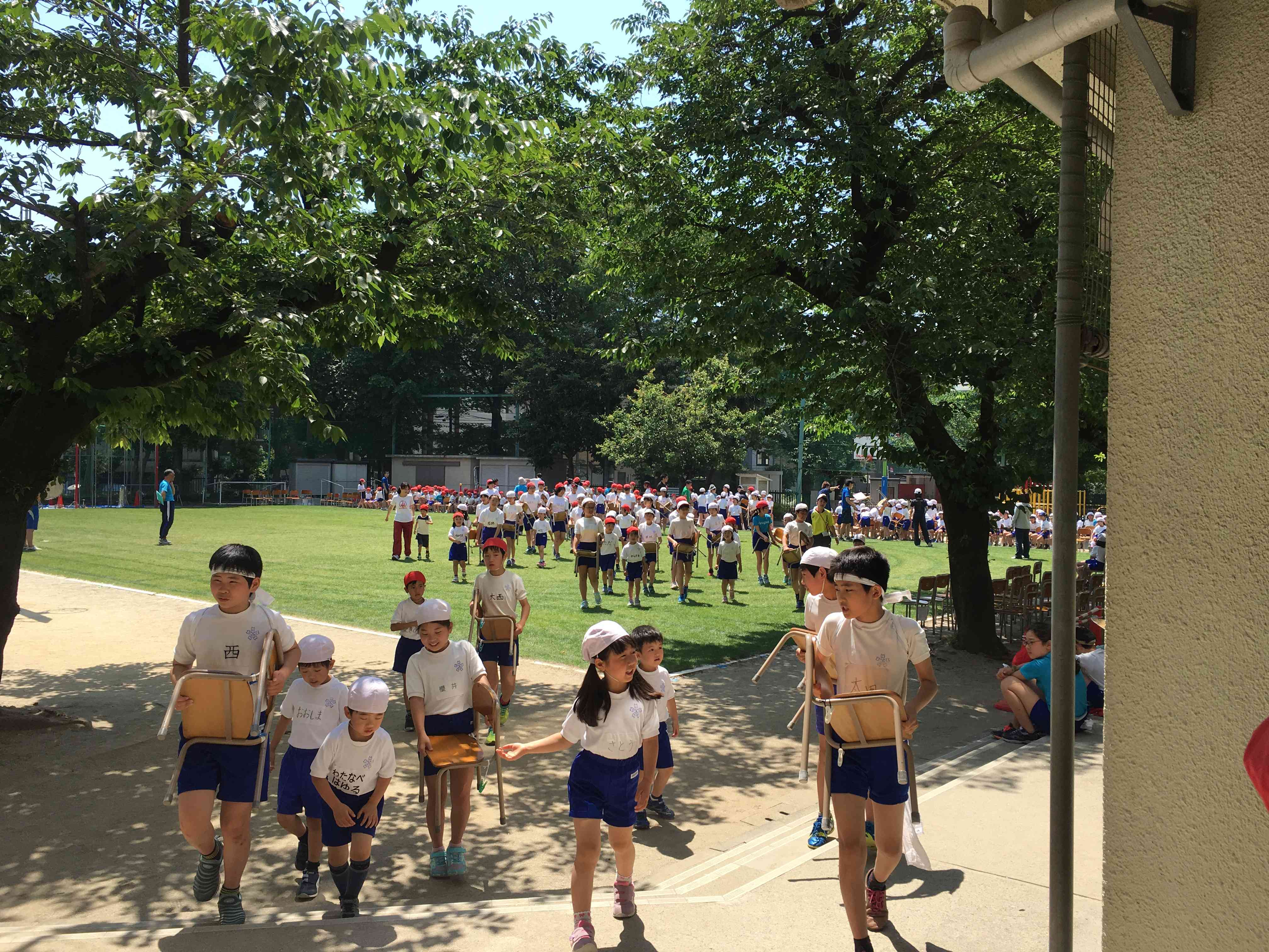 今日は運動会の全体練習を見に来ました。が、着いた時には既に終了。残念。6年生が1年生の椅子を持って、一緒に退場するところでした。