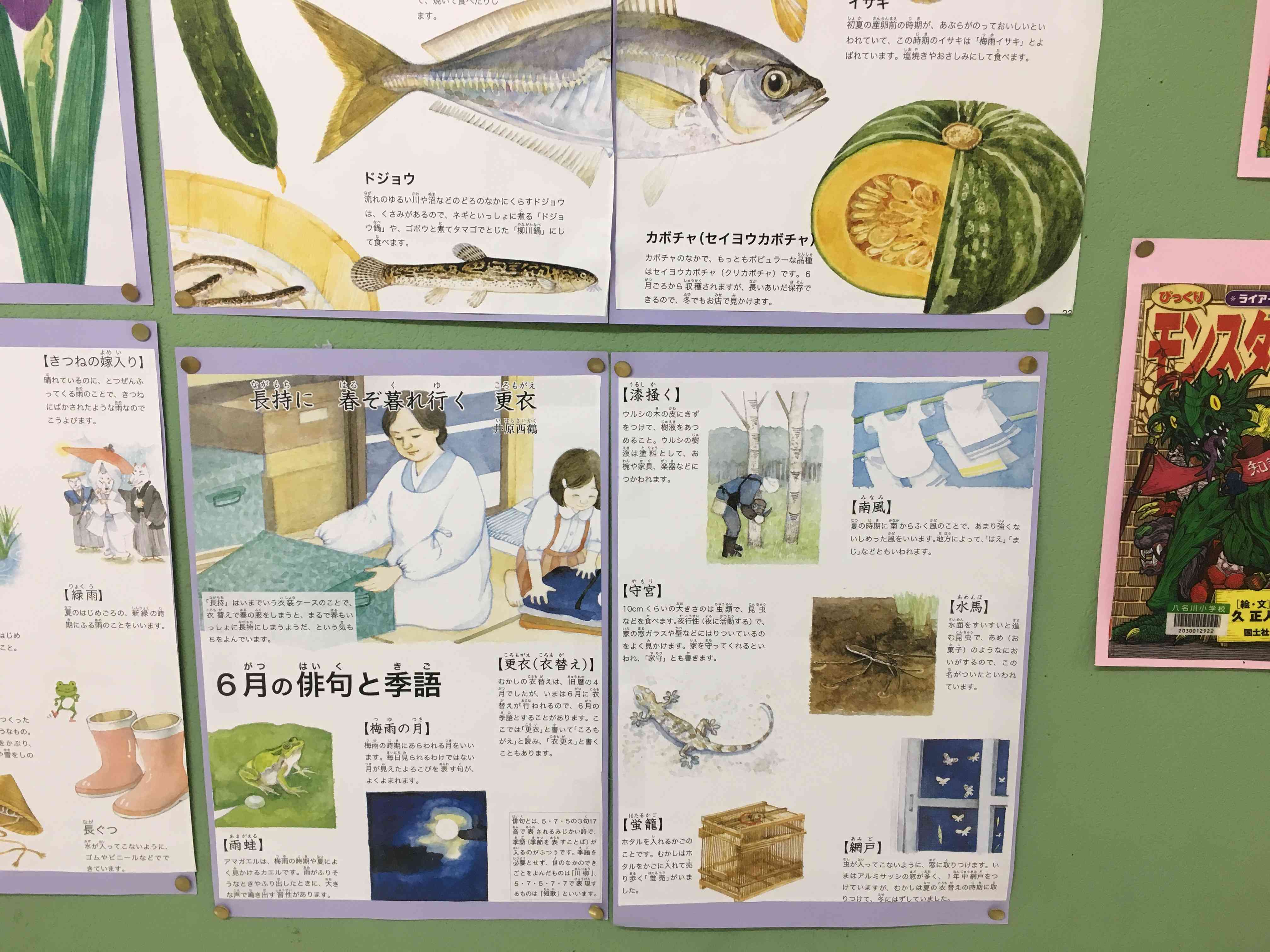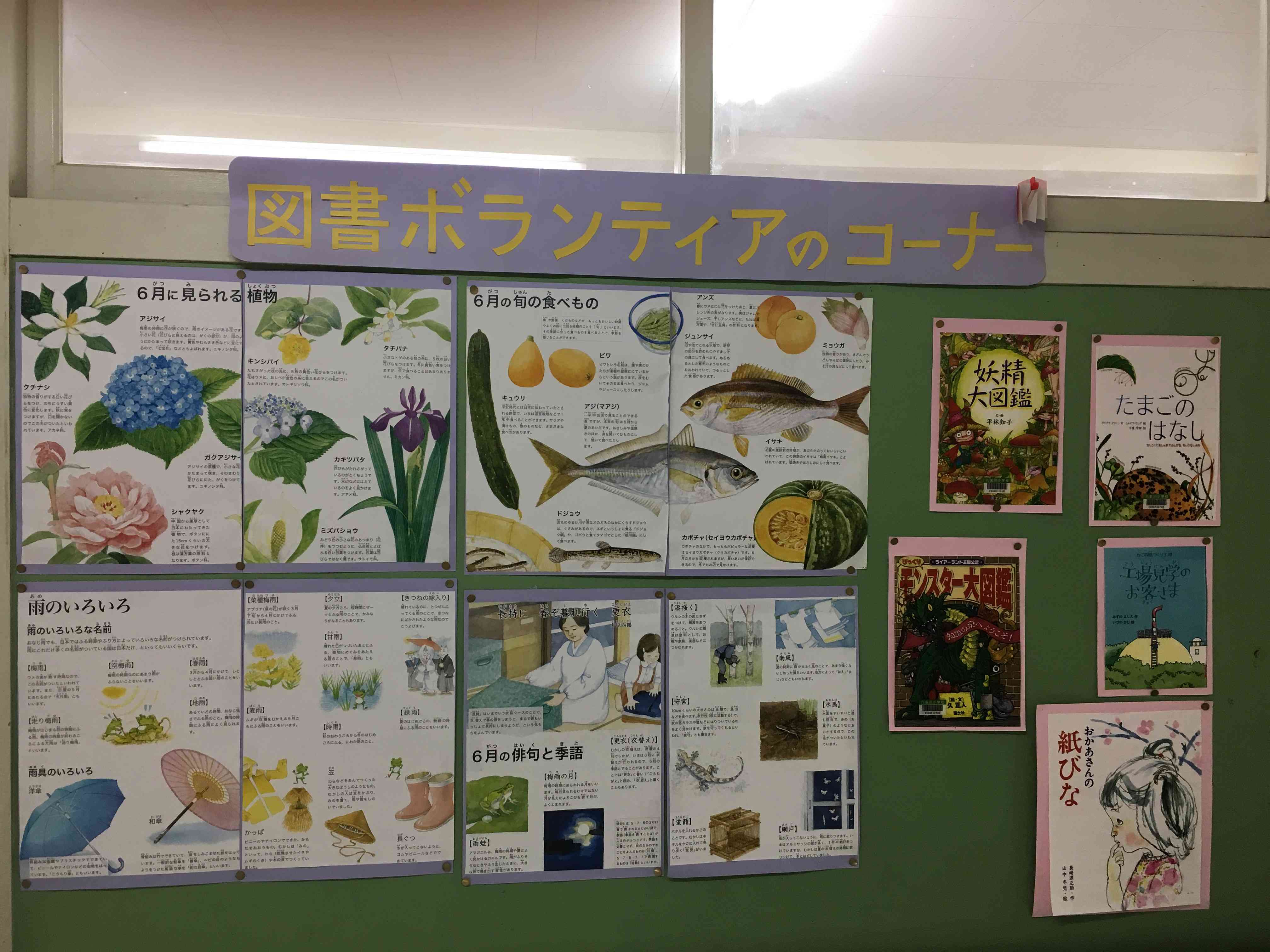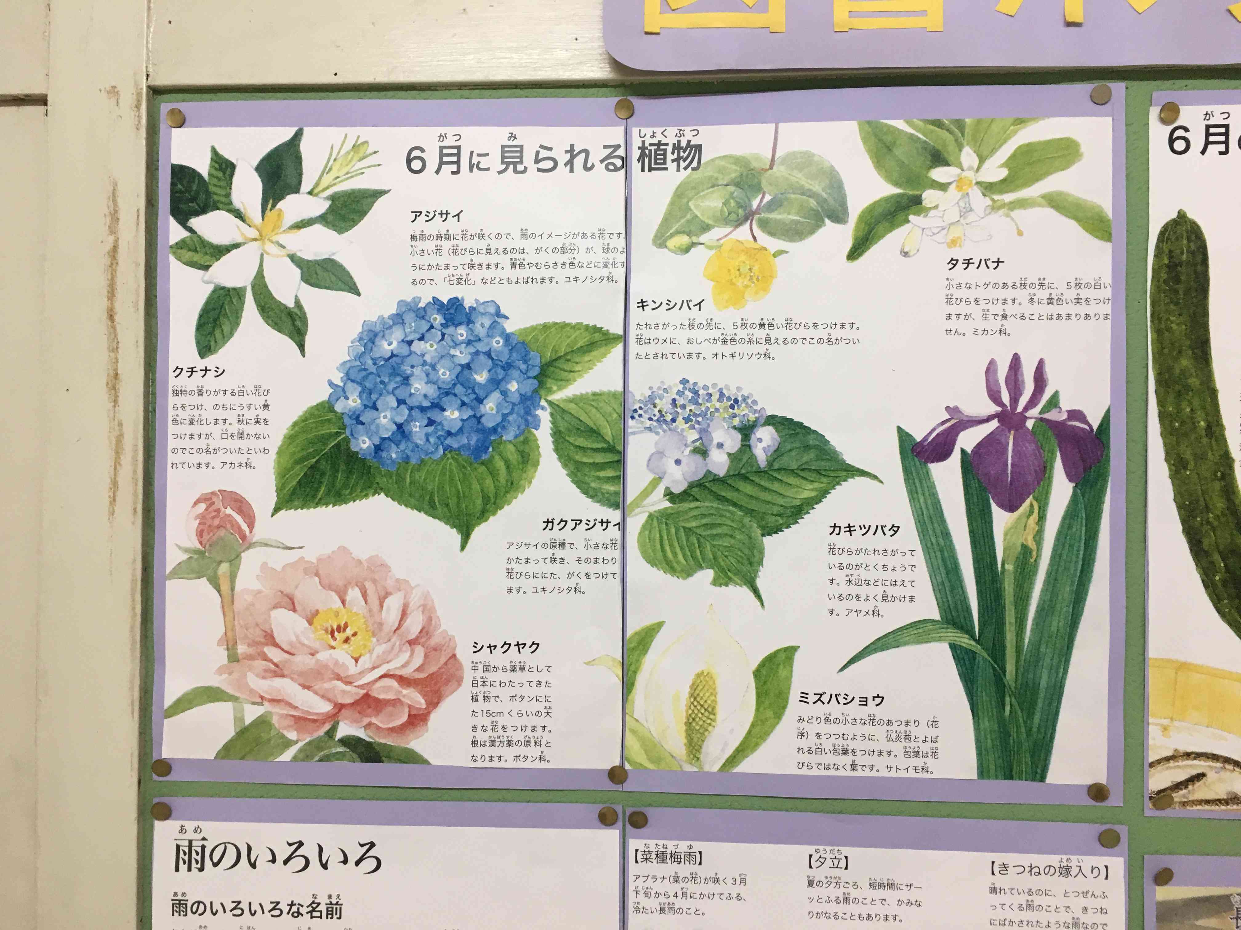それから、図書室の掲示が素敵でしたので、写真におさめてみました。既に梅雨の掲示。季節早どりです。