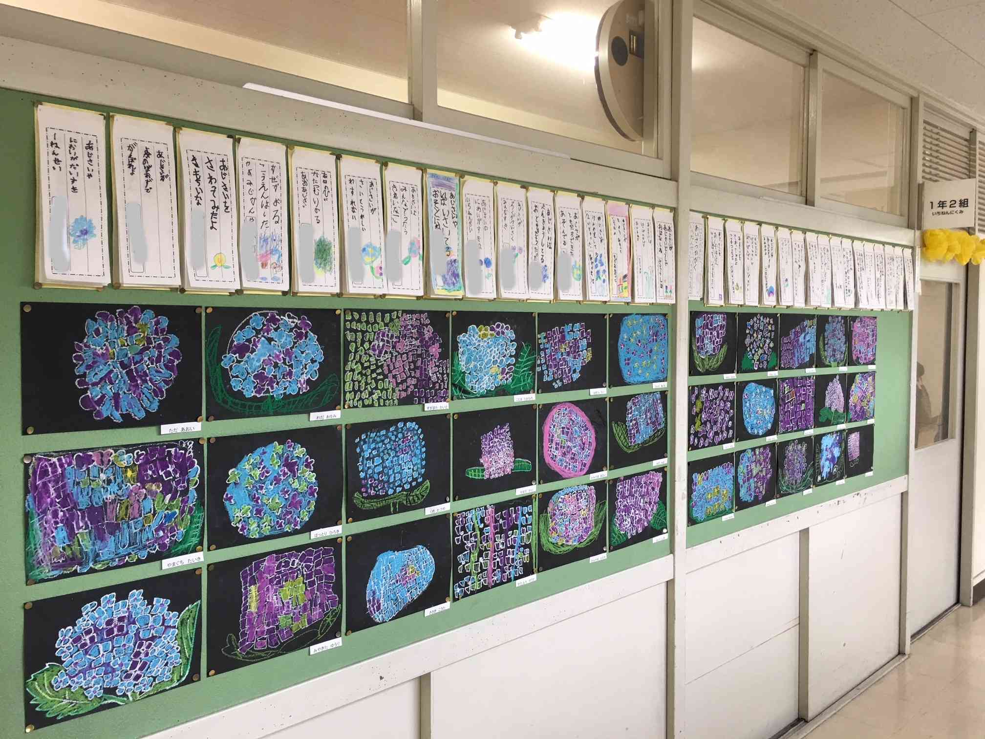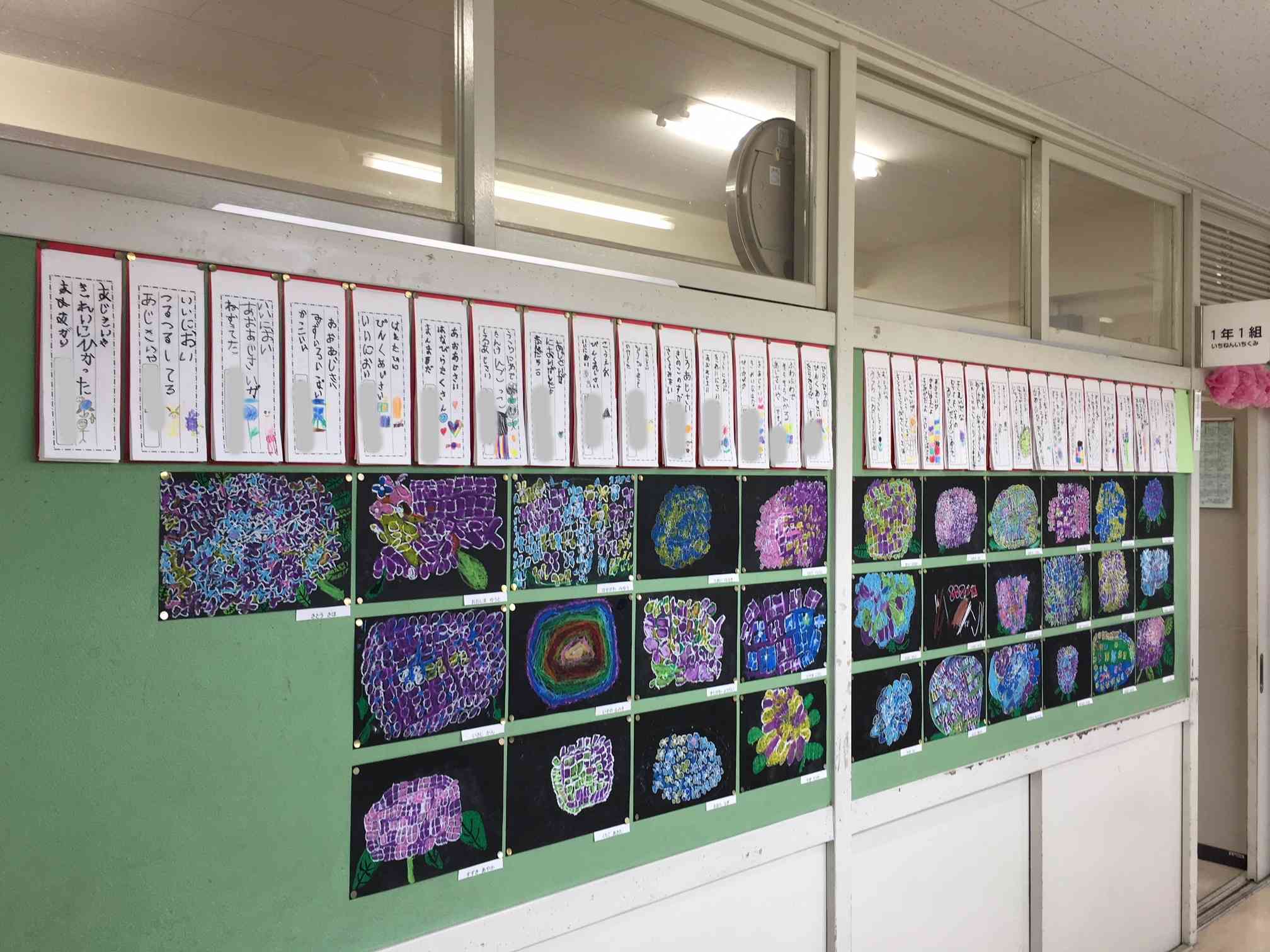 今日から学校公開がスタートしました! 1年生の教室には朝から保護者の皆様の姿が見られました。 1年生はちょっとドキドキしているようでした。 木曜日の朝はお楽しみの読み聞かせタイムがあります♪ 1年生の教室に行くと、子どもたちが絵本に合わせて手遊びをしていました。 1年1組の絵本は「大阪うまいもんの歌」と「やんすけとやんすけとやんすけ」をボランティアの方が楽しく読んでくださっていました。 ♪大阪にはうまいもんがいっぱいあるんやで~ たこ焼き ぎょうざ お好み焼き 豚まん♪ そんな手遊びをしながら、朝から食べたくなった子も多かったと思います(笑) そして、廊下には先週描いた紫陽花の絵が掲示されていました。 廊下を通るだけで華やかな気持ちになりました。 そして、俳句も紫陽花の句に! 思わずくすっとしてしまうようなかわいい句もたくさんありましたので、是非ご覧ください。 入学してから、すでに四句目! 卒業する頃にはみんな俳句の達人になってるかな(笑)【添付ファイル】